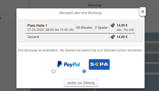 Freiplatzbuchungen sind für Mitglieder selbstverständlich kostenfrei. Der nachfolgende Prozess beschreibt deshalb nur zahlungspflichtige Buchungen, wie z.B. Hallenbuchungen und Gastspielerbuchungen: