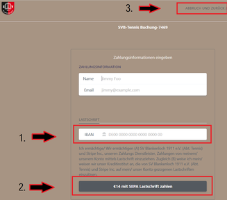 - Sie werden zum SEPA-Bezahlformular weitergeleitet und können hier ihre IBAN Nummer (1.) eintragen und mit "€XX mit SEPA Lastschrift zahlen" (2.) bestätigen. Sollten sie sich hier aber dazu entschließen, die Stunde doch nicht zu buchen, dann bitte oben rechts "Abbruch und zurück zu SVB-Tennis Bookingsystem" (3.) wählen. Nach erfolgreicher Bezahlung werden sie auf die Übersichtsseite des Buchungssystems geleitet und die gebuchte Stunde erscheint als "Ihre Buchung" im Tagesplan.