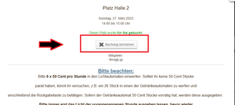 - Um eine Stunde zu stornieren, bitte im Tagesplan die zu stornierende Stunde anklicken und im folgenden Popup Fenster den Button "Buchung stornieren" wählen. Anschließend steht die Stunde wieder für Buchungen zur Verfügung.